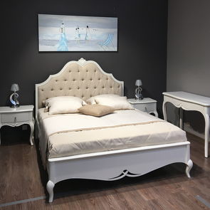 Кровать с решеткой , отделка молочно-белый матовый лак, ткань светло-бежевый велюр