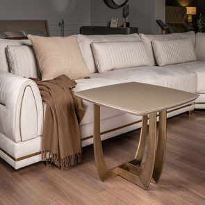 Приставной столик, отделка бежевый камень, закаленное стекло, латунь