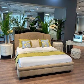Кровать с решеткой, отделка белый блестящий лак, ткань Velour 220-03