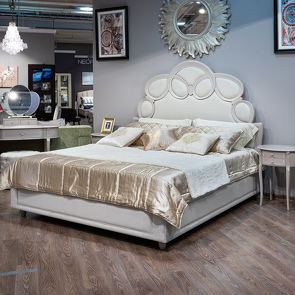 Кровать с решеткой, отделка молочно-белый матовый лак, ткань светло-бежевый велюр