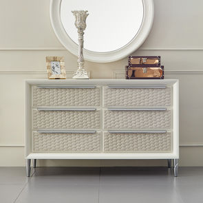 Комод, отделка жемчужный белый лак, ткань Anyzo-01 с рисунком