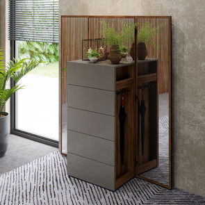 Комод высокий с зеркалом, отделка шпон ореха F, серый глянцевый лак
