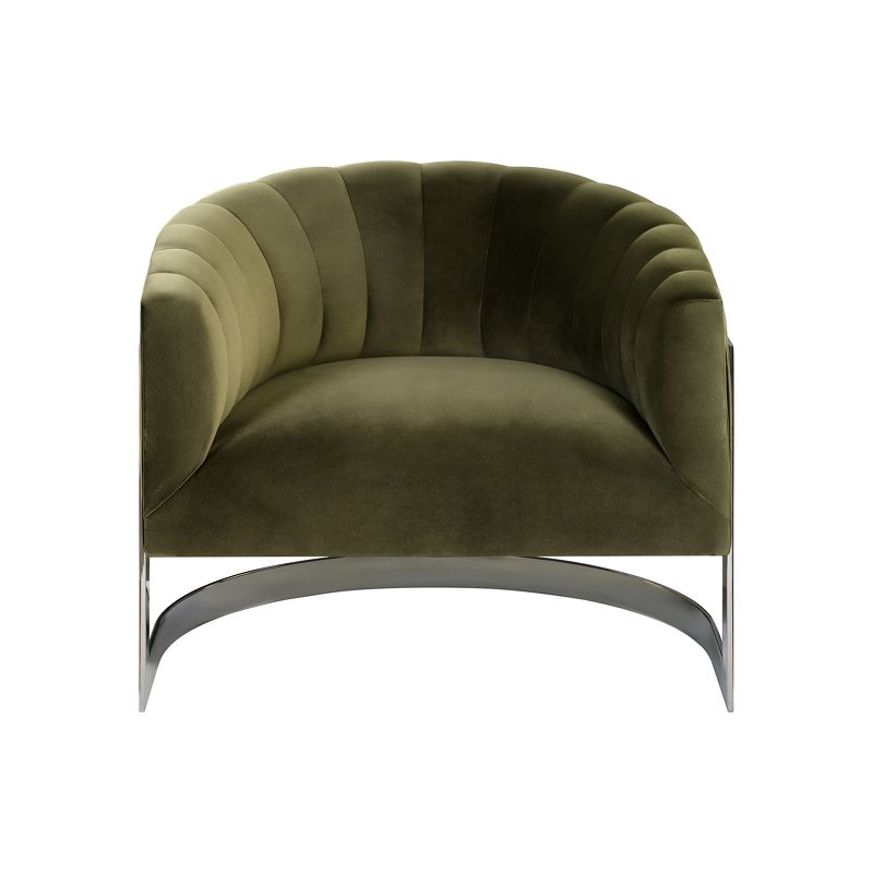 Кресло выполнено в стиле Ар-деко. Спинка декорирована вертикальной стежкой. Каркас изготовлен из массива бука. Сидение на эластичных ремнях, наполнитель пенополиуретан. Ножки металл.