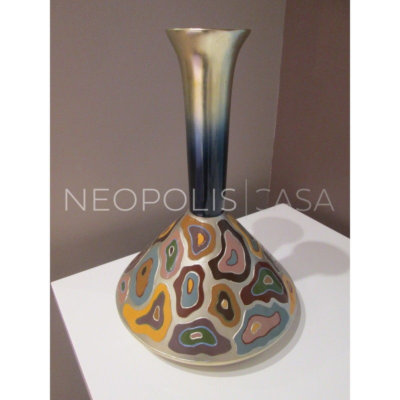 Ваза необычной формы выполнена в стиле Ар деко. Как красиво, когда строгий и классический дизайн комнаты оживляется натуральными цветами. Ваза сочетает в себе элементы античной классики и в стиле хай-тек. Узкое длинное горлышко и яркий абстрактный рисунок подчеркивают оригинальность и изящность модели.