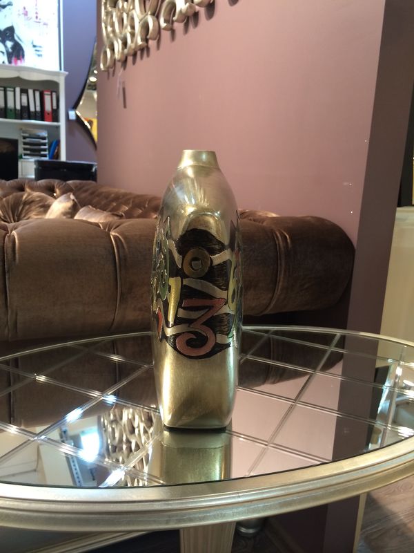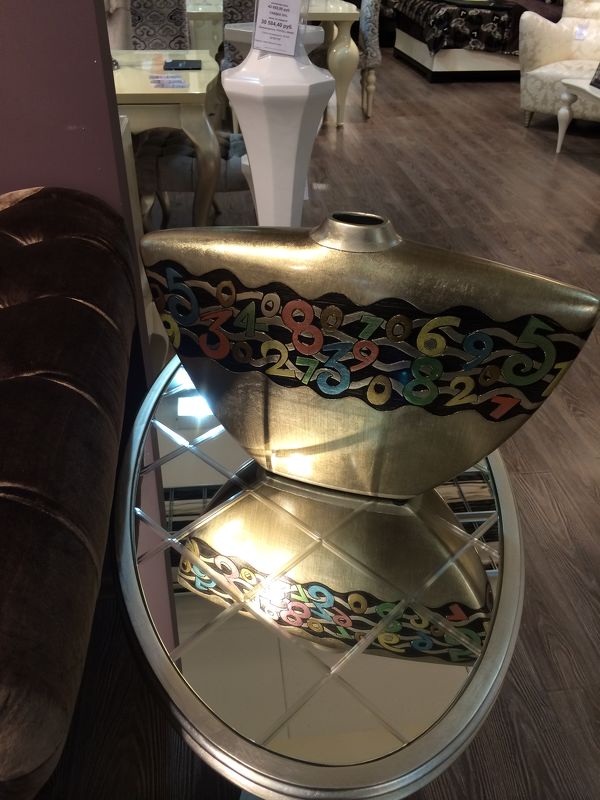 Трапециевидная форма вазы передает колорит эпохи античности. Волнистые линии в орнаменте и хаотично расположенные цифры также относят наше восприятие во времена Евклида и Пифагора. А вот интересная, переходящая от темного к светлому, цветовая гамма, и серебряная отделка создают впечатления металлической поверхности вазы. Аксессуар изготовлен из фарфора, что значительно повышает его ценность.