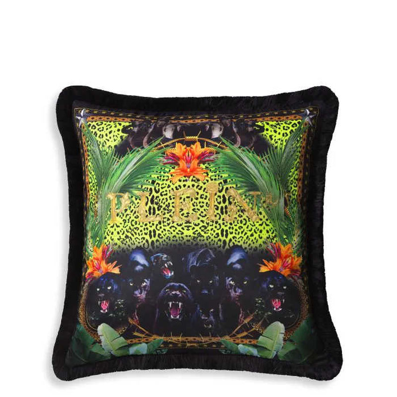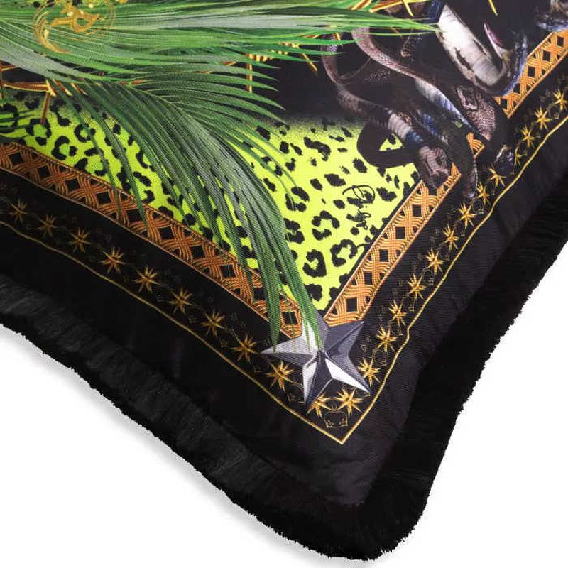 Подушка Jungle из чистого шелка, с принтом диких животных джунглей и пышном дизайном фауны, с окантовкой в виде золотой цепи и подписью Plein. Состав ткани 100% шелк.