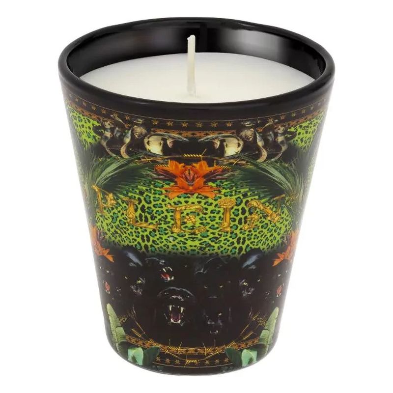 Подсвечник из дутого стекла, украшен индивидуальным принтом Jungle с изображением экзотических зверей и тропических растений. Вылитая восковая свеча имеет тонкий аромат.