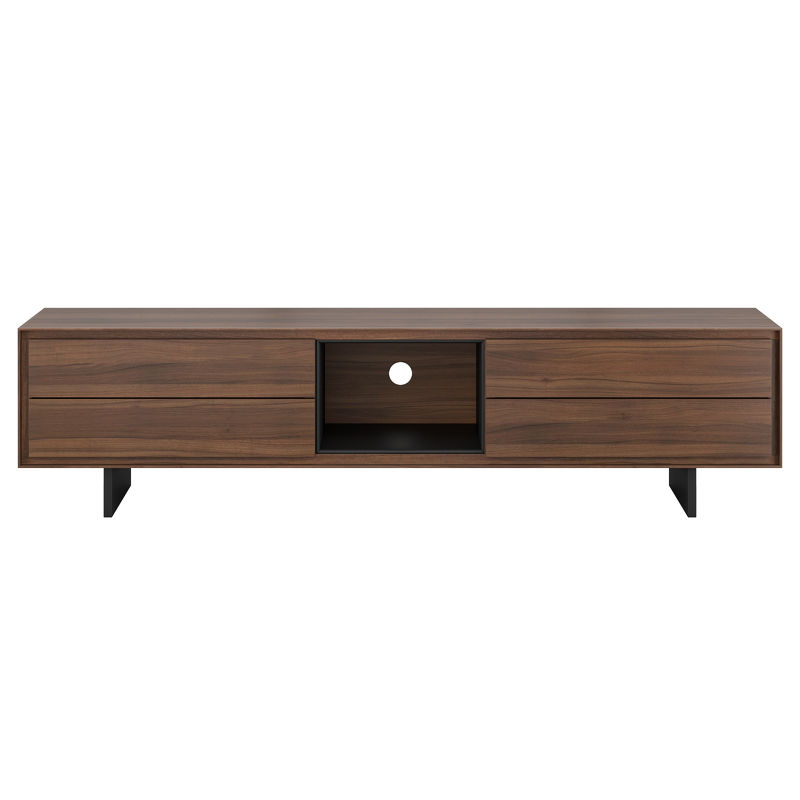 ТВ тумба выполнена из высококачественного, сертифицированного МДФ высокой плотности. Отделка - натуральный шпон северо-американского ореха. Ножки и вставка в открытой полке выполнены из метала и окрашены в черный матовый цвет.