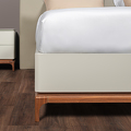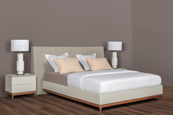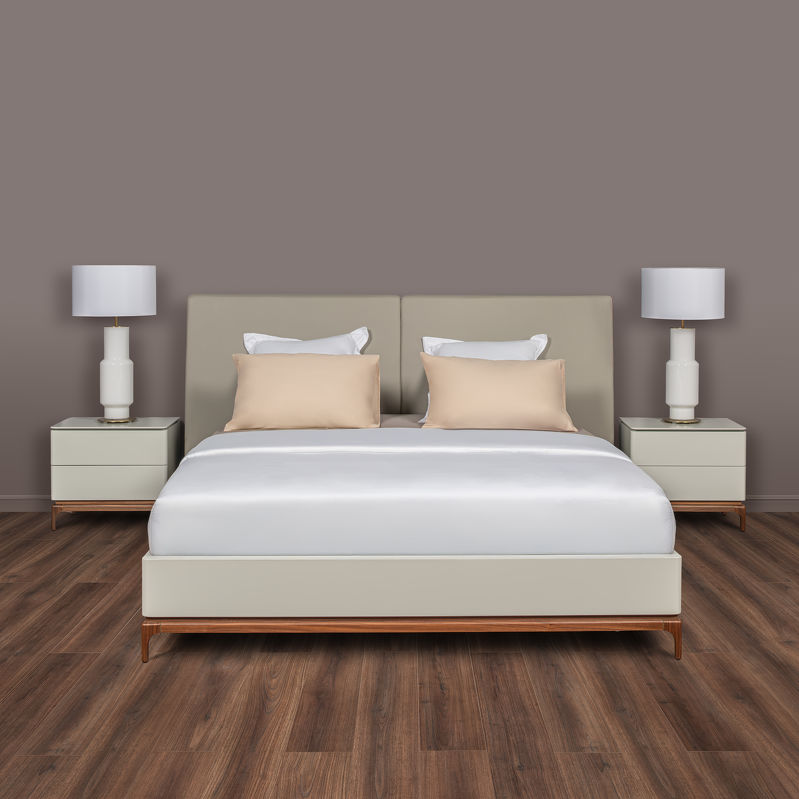 Изголовье и каркас кровати выполнен из МДФ высокой прочности, отделка матовый лак светло-серого оттенка. Тонкая база кровати изготовлена из массива дерева, отделка натуральный шпон ореха.
