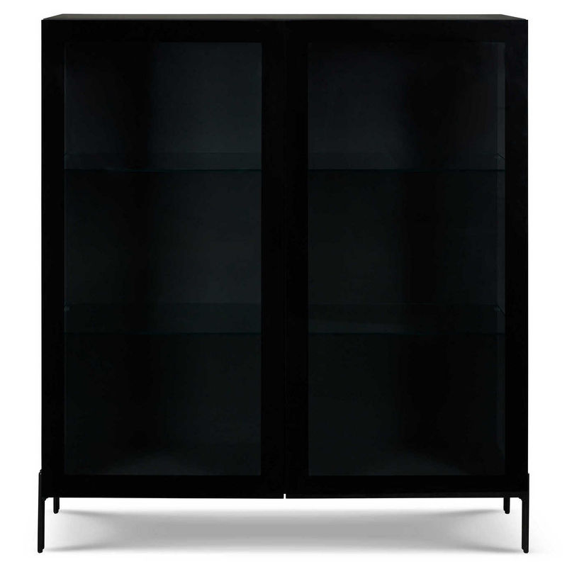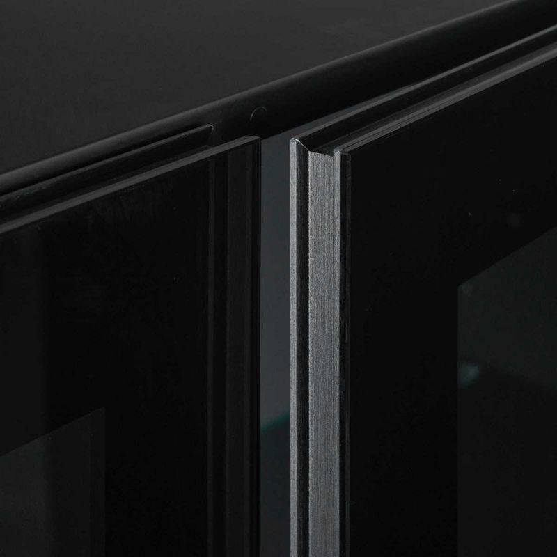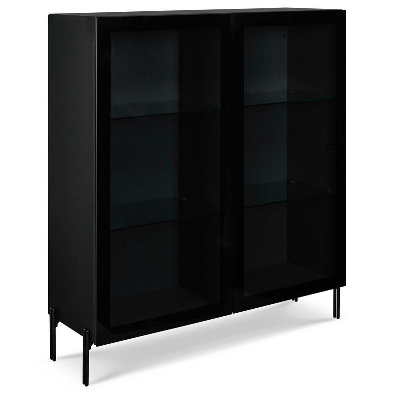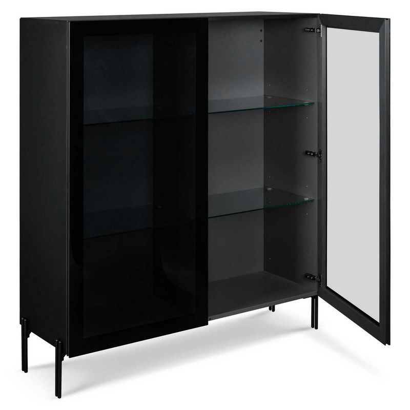 Витрина выполнена в современном стиле с двумя стеклянными дверками.