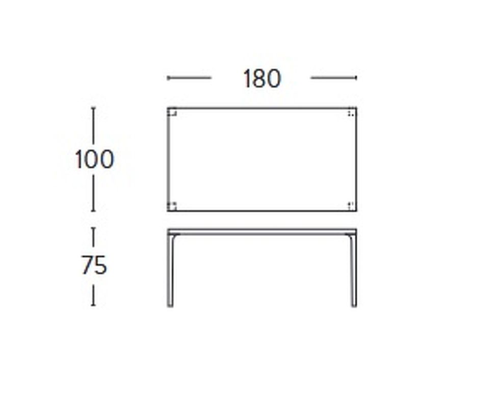 Обеденный стол выполнен в современном стиле. Фиксированная столешница прямоугольной формы с закруглеными углами опирается на прямые металлические ножки.