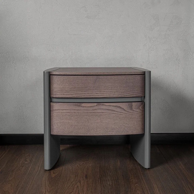 Прикроватная тумбочка с двумя выдвижными ящиками выполнена в современном стиле.