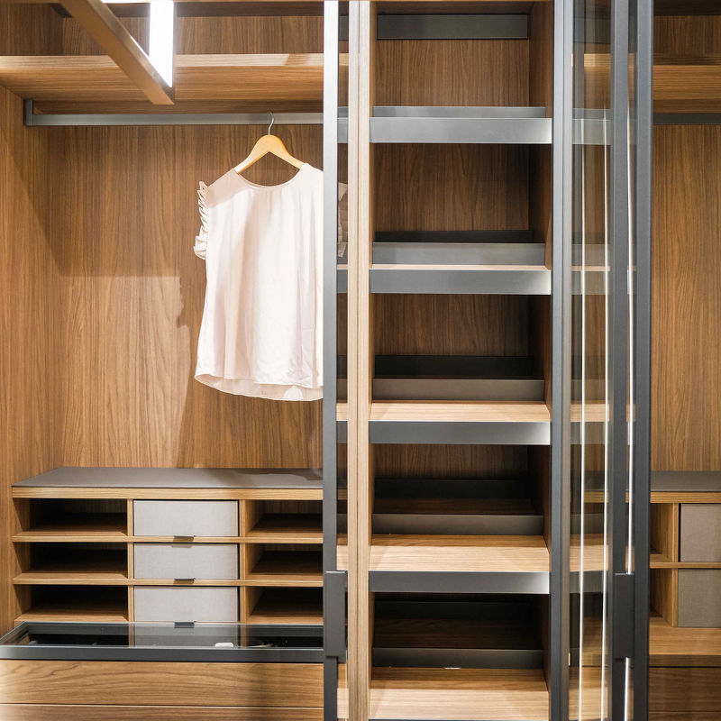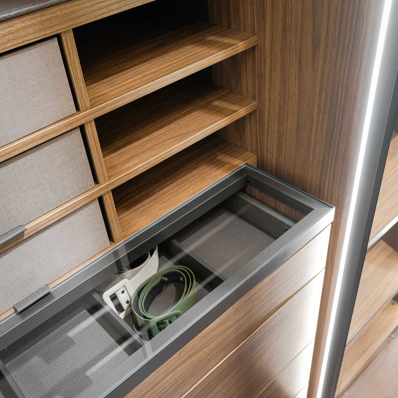 Гардероб выполнен в современном стиле. Гардероб со стеклянными распашными дверками оснащен штангами для одежды, комодом с выдвижными ящиками, открытыми полками и подсветкой.