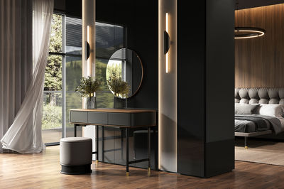 Дизайн восхищает эксклюзивным узором на черных фасадах мебели, выполненным методом тиснения. В данном случае — на двух ящиках.