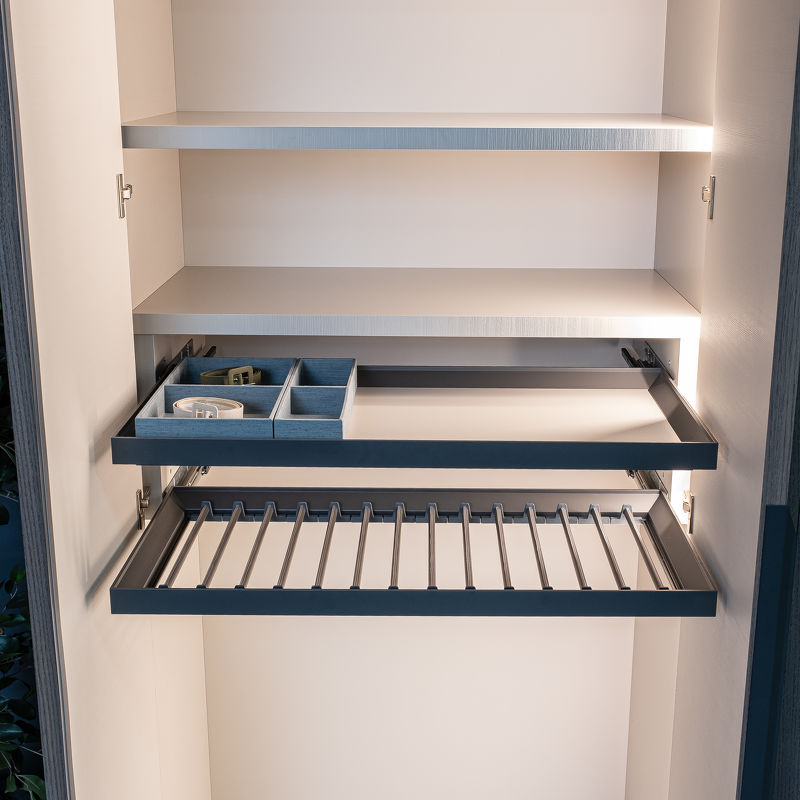 Вы можете выбрать и скомпоновать любое количество полок, выдвижных ящиков, обувниц, брючниц, полок для хранения аксессуаров и прочих элементов, обрамив внутреннее наполнение в корпус со стильными распашными дверками. Размер корпуса и количество дверей можно выбрать в зависимоти от размеров помещения. Наши менеджеры готовы помочь в выборе и составить индивидуальные проекты.