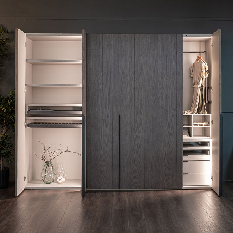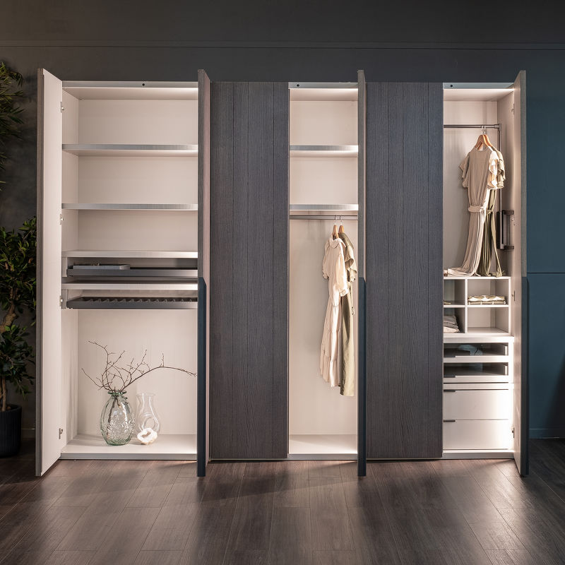 Гардероб выполнен в современном стиле. Шкафы от итальянской фабрики Alf Dafre отличаются высоким качеством компонентов. Механизмы, изготовленные из самых современных материалов, протестированы на протяжении более 80 000 циклов открывания и гарантируют долговечность и надежность.