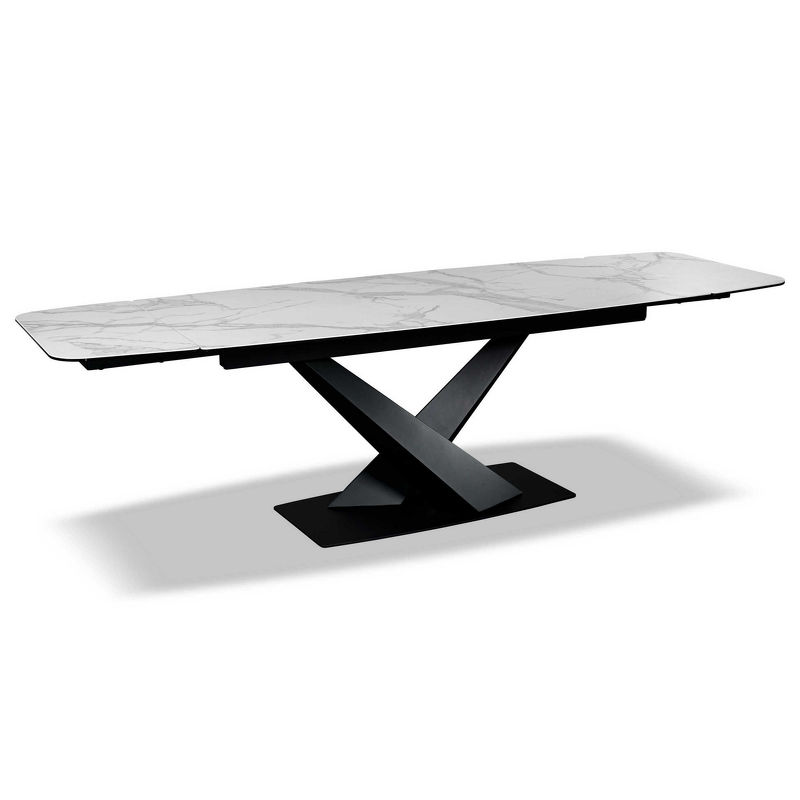 Обеденный стол раздвижной, отделка закаленное стекло с керамикой, черный металл