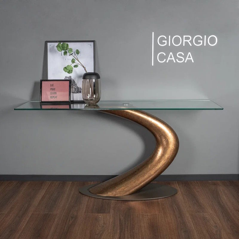 Консоль с изогнутой ножкой на металлическом основании и стеклянным топом выполнена в современном стиле.
