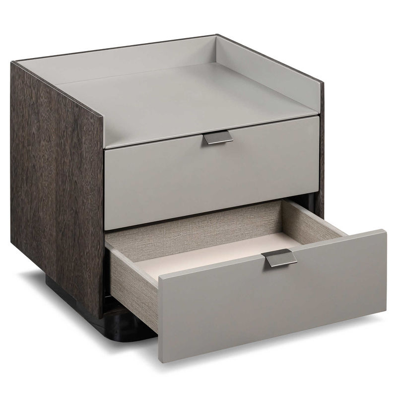 Прикроватная тумбочка от итальянского бренда Fratelli Barri. Каркас из высококачественной МДФ. Боковины выполнены в отделке шпоном дымчатого дуба, фасады ящиков — в отделке матовым лаком. Основание тумбочки изготовлено из темного металла.
