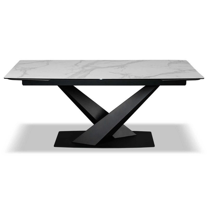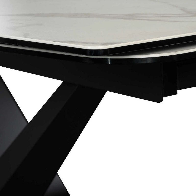 Обеденный стол раздвижной, отделка закаленное стекло с керамикой, черный металл
