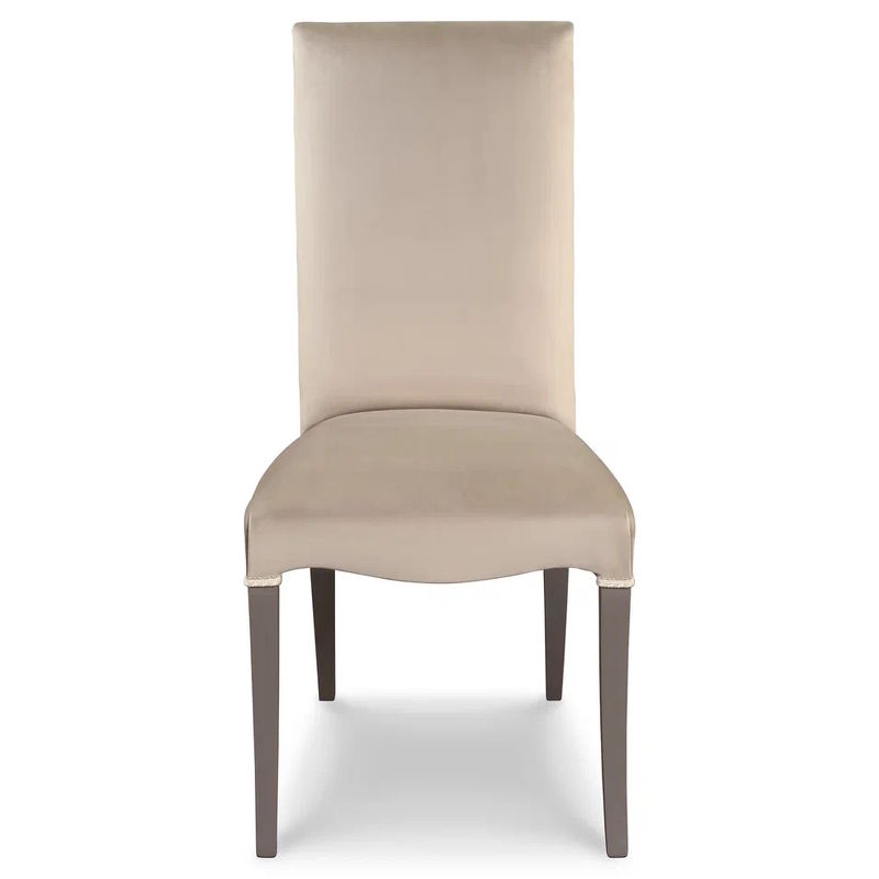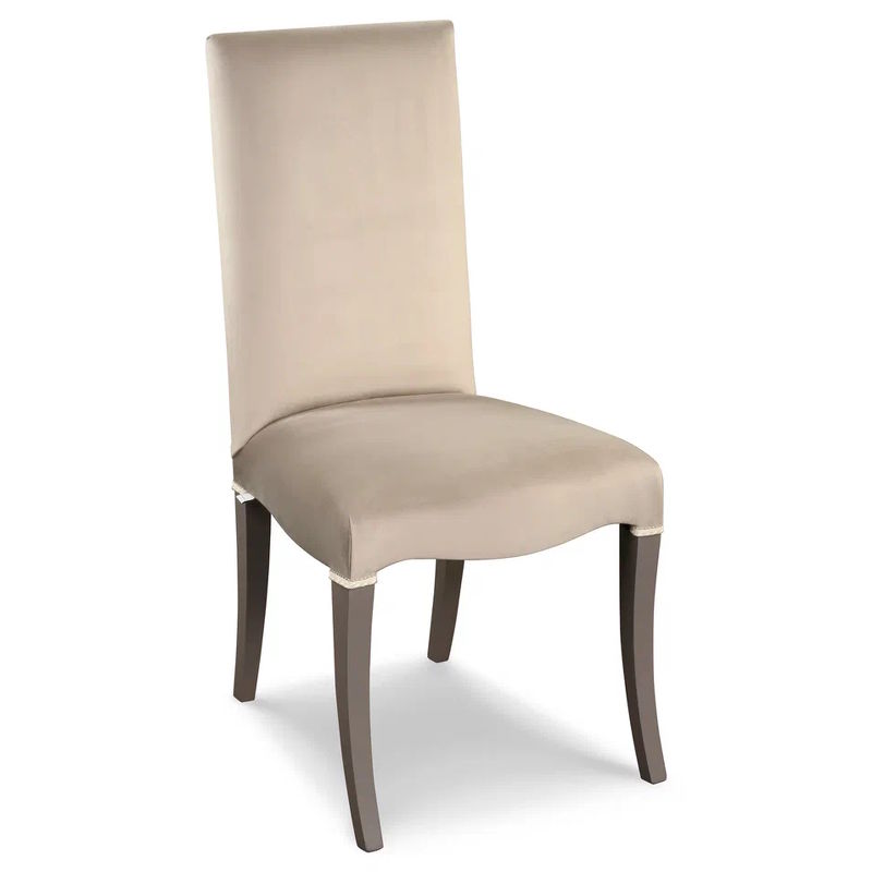 Стул на слегка изогнутых ножках выполнен в классическом стиле из массива бука. Обтянут тканью из ассортимента фабрики с отделкой декоративным шнуром.
