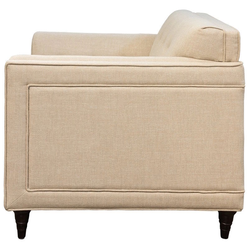 Каркас — натуральный массив дерева, отделка (ножки) — натуральный шпон махагона, обивка — кремовая рогожка.