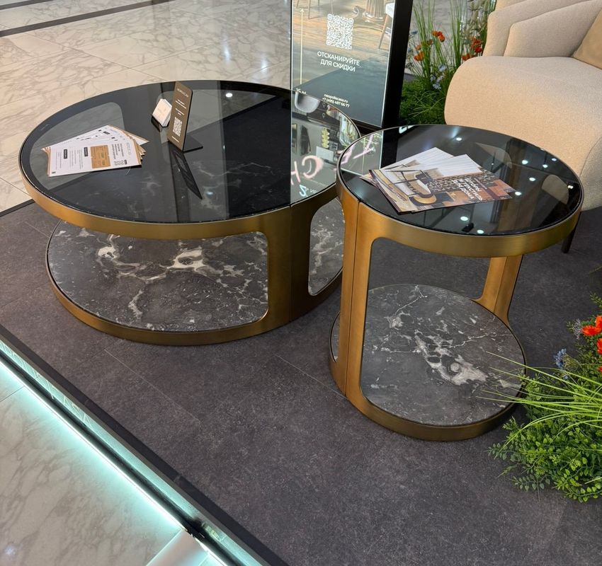 Структура выполнена из нержавеющей стали в цвете латунь, столешница - тонированное закаленное прозрачное стекло в графитовых тонах, база - натуральный мрамор в темно-серых тонах с прожилками.