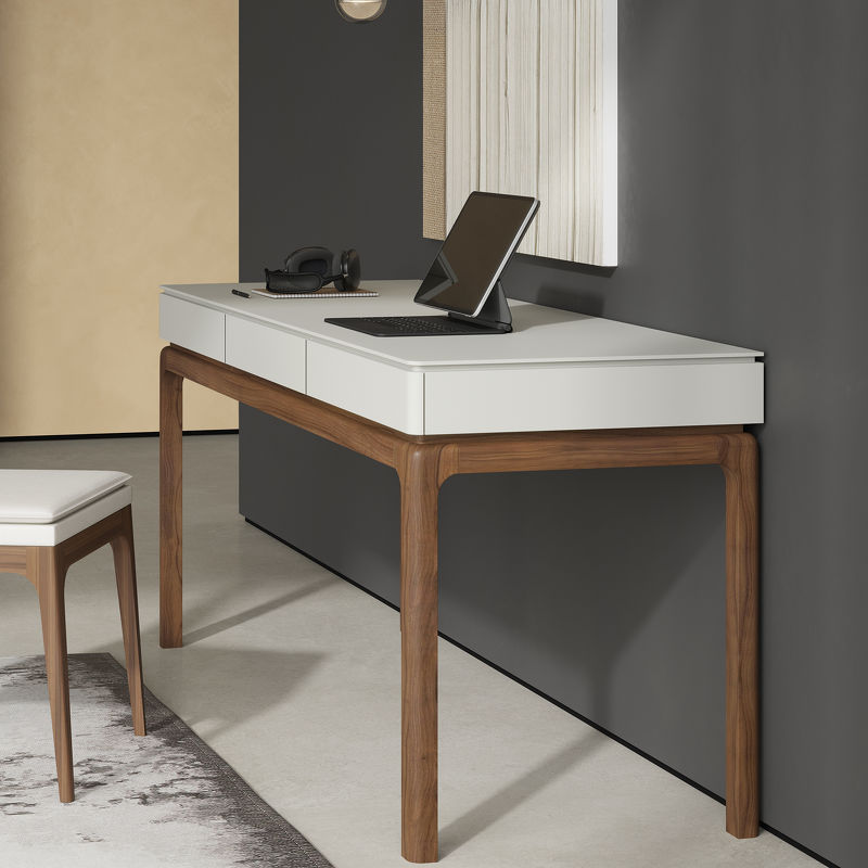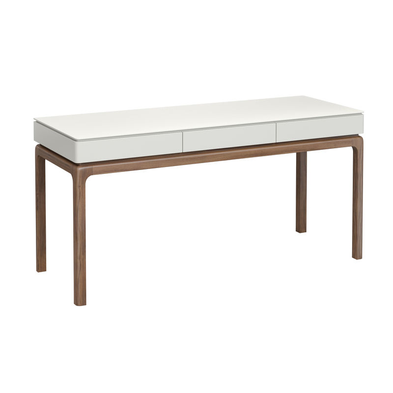 Письменный стол с тремя выдвижными ящиками от бренда Mod Interiors. Закругленные углы и тонкая столешница придают столу изысканный вид.