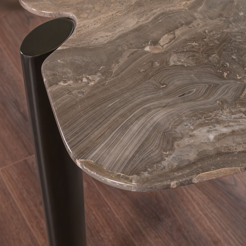 Плавные линии столешницы, контраст металла и теплого бежевого с прожилками цвета камня создают особую атмосферу и заставляют раз за разом прикасаться к столу.