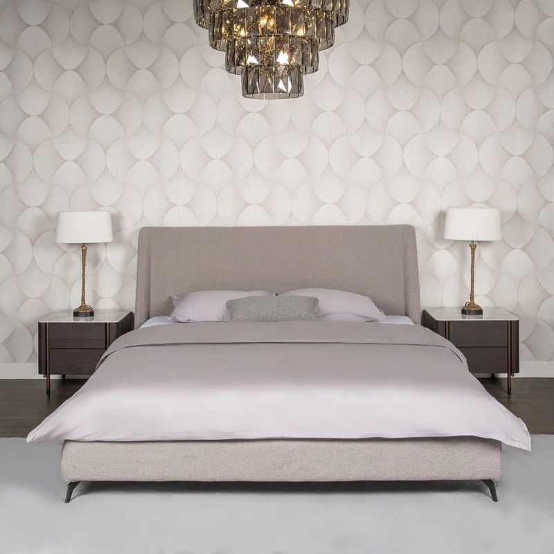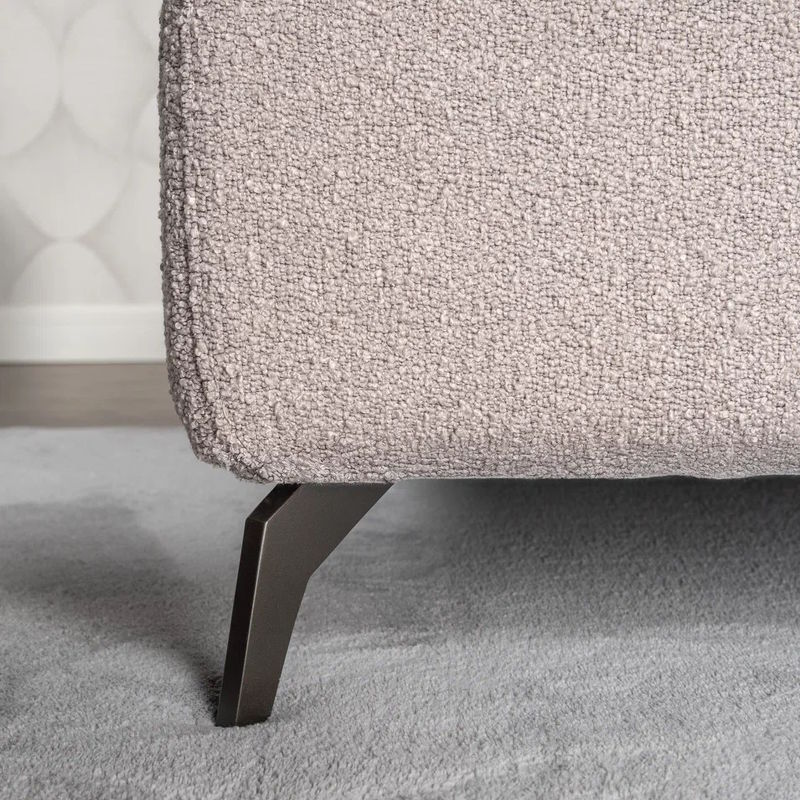 Кровать обита текстурированной тканью букле в серых тонах, ножки из нержавеющей стали с черным порошковым покрытием.