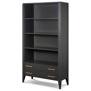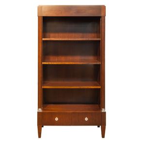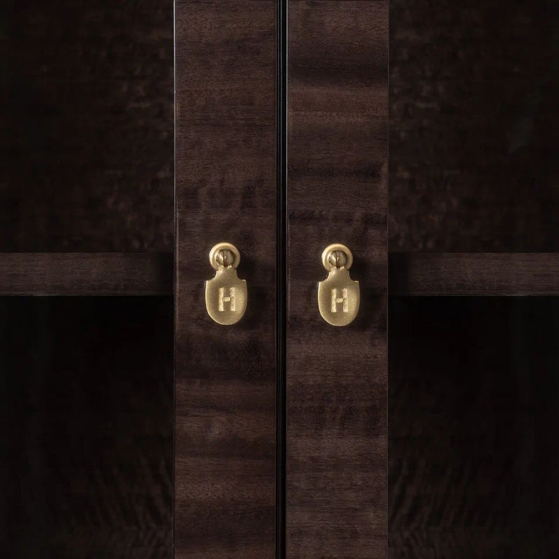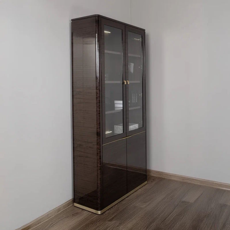 Благородный шпон эвкалипта тонирован в темно-коричневый цвет и покрыт глянцевым лаком. Детали базы и ручки выполнены в металле в цвете латунь.