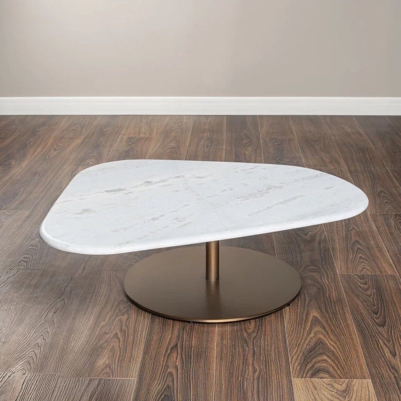 Столешница столика - голубой мрамор Dream blue Matt. Натуральный мрамор может иметь разный природный рисунок и разную насыщенность цвета, от практически белого до бело-голубого с яркими голубыми жилами, то есть, каждое изделие является уникальным. Основание столика - металл в цвете латунь.