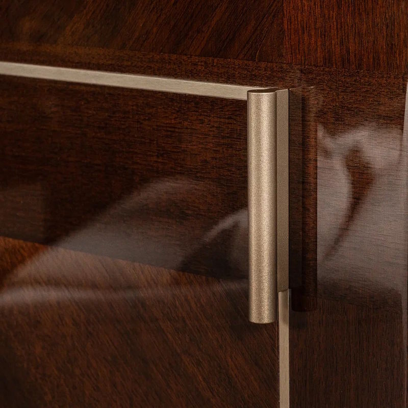 Для отделки использован шпон натурального ореха кофейного оттенка, покрытый глянцевым лаком. Металлические профили цвета розовое золото с округлыми ручками создают оригинальный геометрический мотив. Комплектуется двумя полками и четырьмя штангами.