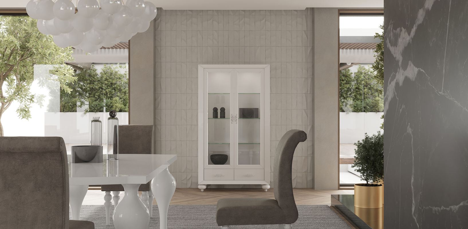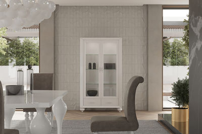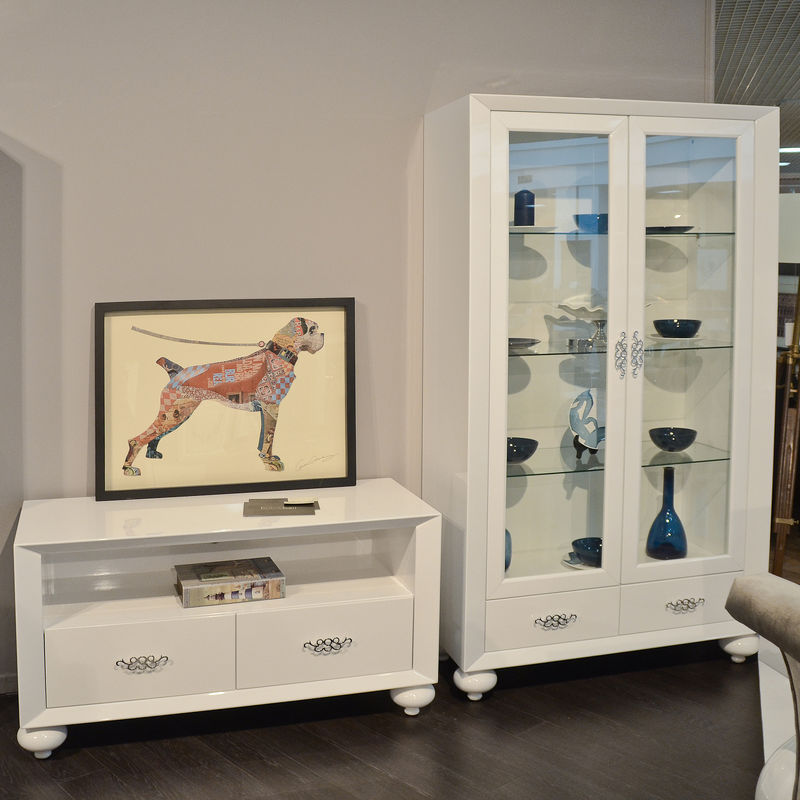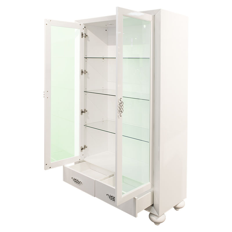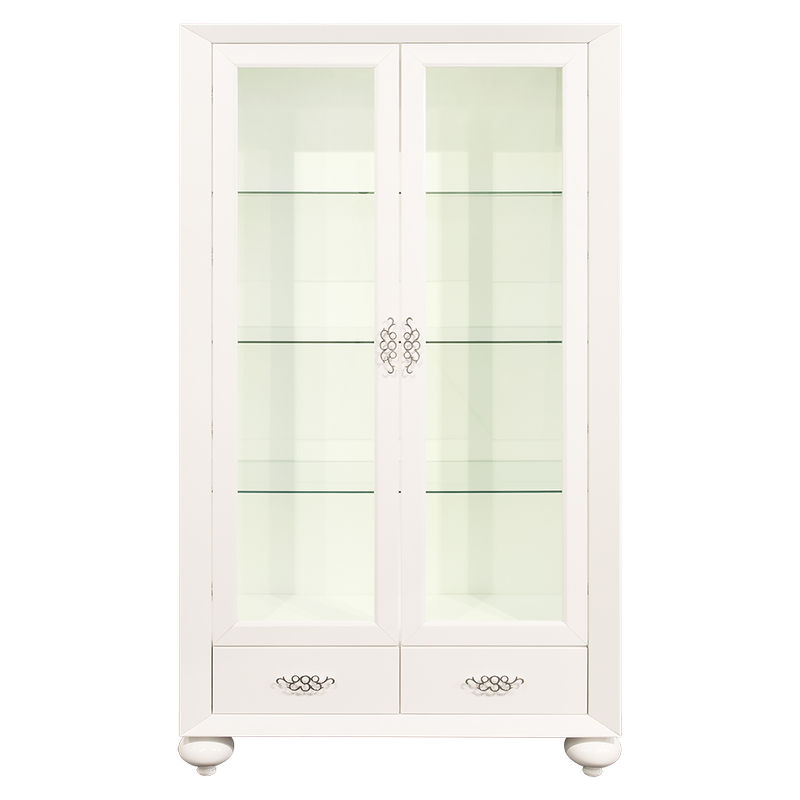 Витрина с 2 распашными стеклянными дверками выполнена в современном стиле. Отделка белый блестящий лак. Внутреннее наполнение 3 стеклянные полки и подсветка. Дополнена 2 выдвижными ящиками с системой плавного закрывания. Сделана из высококачественного МДФ высокой плотности и массива дерева.