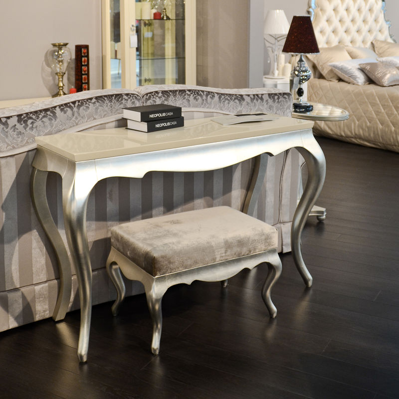 Отделка столешницы - перламутровый кремовый лак. Высокие гнутые ножки в отделке сусальное серебро, покрытое лаком шампань - ручное нанесение.