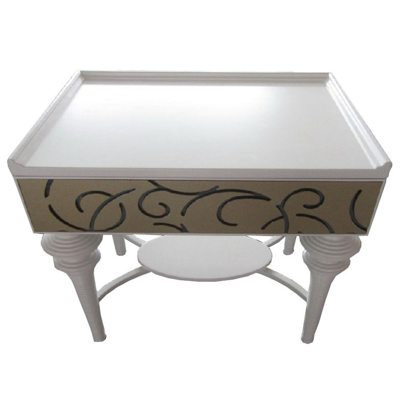 Прикроватная тумбочка с выдвижным ящиком выполнена в стиле Ар деко. Отделка белый матовый лак. Оснащена высокими точеными ножками, объединенных овальной полочкой по центру. Фасад выдвижного ящика украшен рельефным узором, выполненным методом лазерной резки, и покрыт золотой краской. Сделана из высококачественного МДФ высокой плотности и массива дерева.