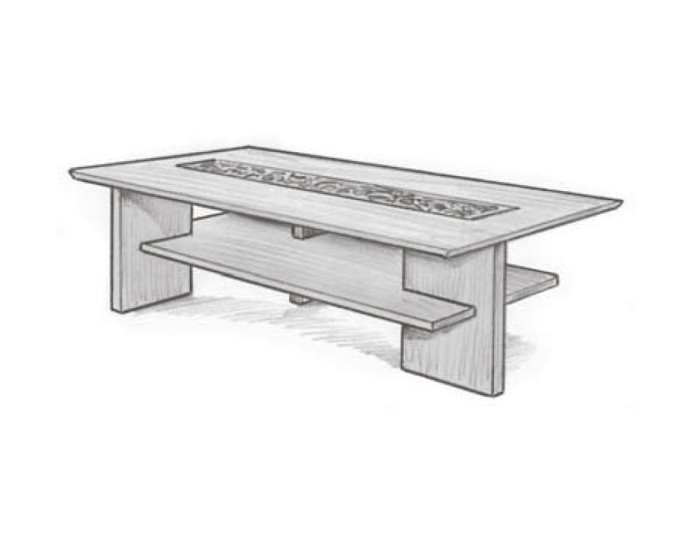 Журнальный столик прямоугольной формы выполнен в стиле Ар-деко из массива ясеня. Оснащен полкой под столешницей. В центре топа ажурная вставка из МДФ.
