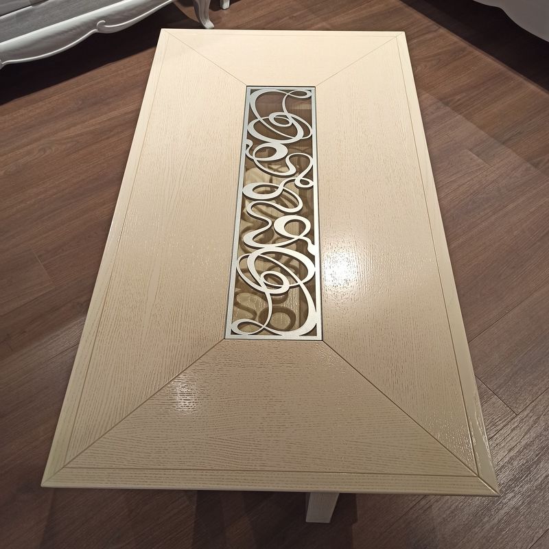 Журнальный столик, отделка кремовый полуматовый лак, ажурная вставка под стекло сусальное серебро