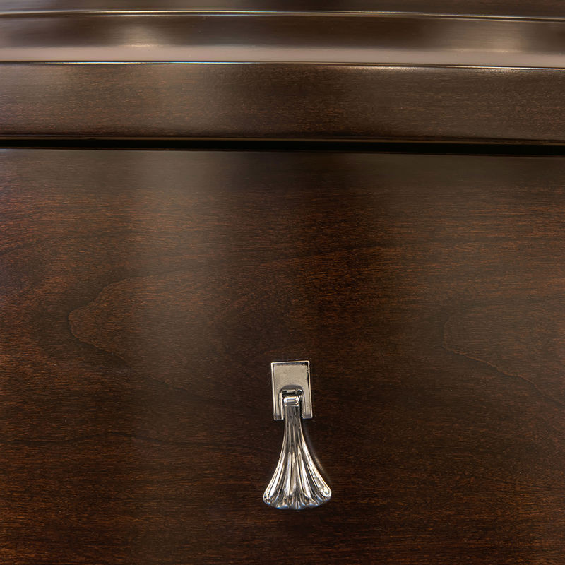 Каркас — массив дерева и высококачественная МДФ высокой плотности, отделка — натуральный шпон вишни. Все выдвижные ящики снабжены скрытыми направляющими. Корпус ящиков в более светлой отделке дерева. Ящики оснащены доводчиками для плавного закрывания. цвет фурнитуры - хром.