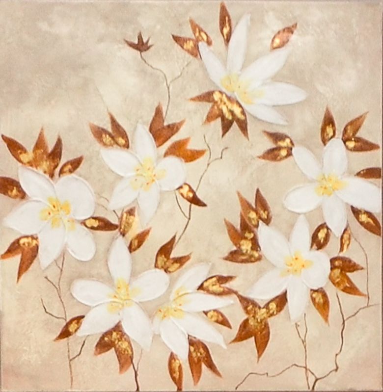 Оригинальная картина во флористическом стиле выполнена в спокойном и уравновешенном цветовом оформлении. Фон бежевого цвета покрыт растительным узором в выдержанных тонах.