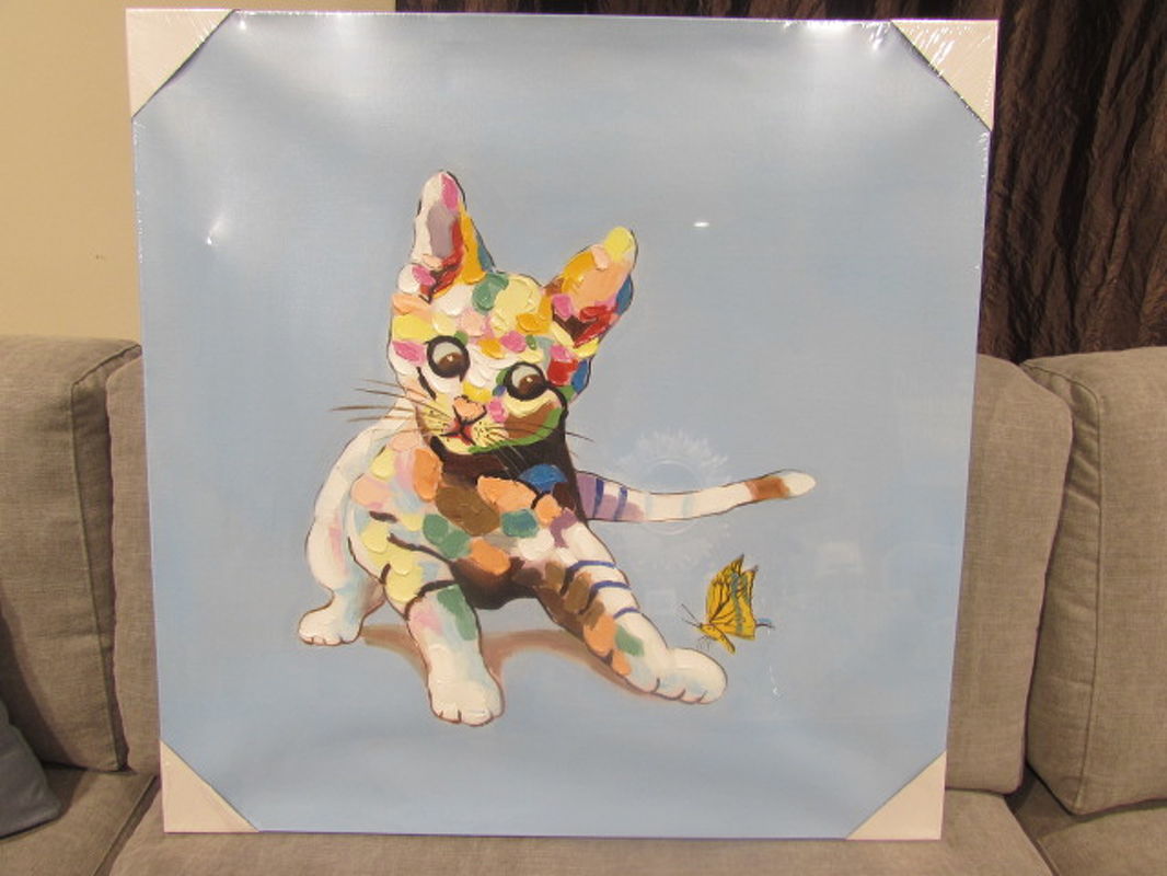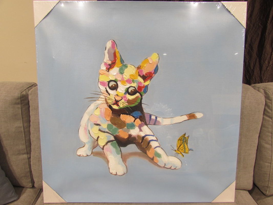 В силу оригинальности задумки художника эксклюзивная картина является оригинальным элементом декора, а силу совершенства исполнения и качества использованных материалов – еще и элитным предметом интерьера. На полотне изображен котенок, играющий с бабочкой. Уникальность картине придают ярко-расставленные акценты.
