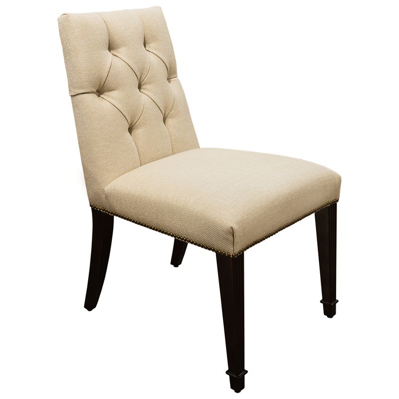 Каркас — натуральный массив дерева, отделка — натуральный шпон махагона, обивка — бежевая рогожка. Спинка обита тканью со стежкой капитоне, спинка сзади и сиденье снизу декорированы гвоздиками.