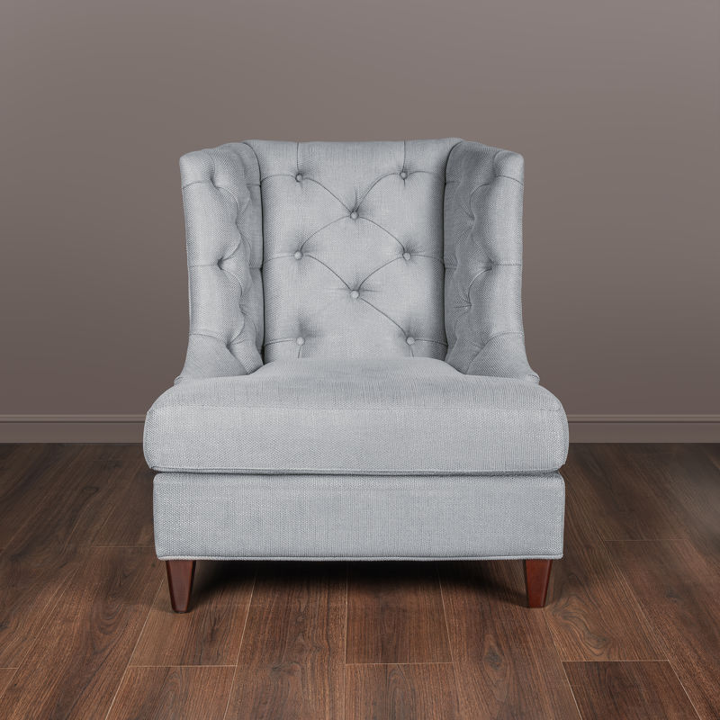 Каркас — натуральный массив дерева, отделка — натуральный шпон махагона, обивка — серо-голубая рогожка. Спинка и «уши» декорированы стежкой капитоне. Вокруг ножек — декоративное обрамление металлическими гвоздиками.