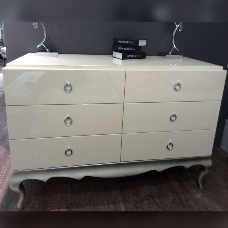 Комод, отделка перламутровый кремовый лак, ножки сусальное серебро, покрытое лаком шампань