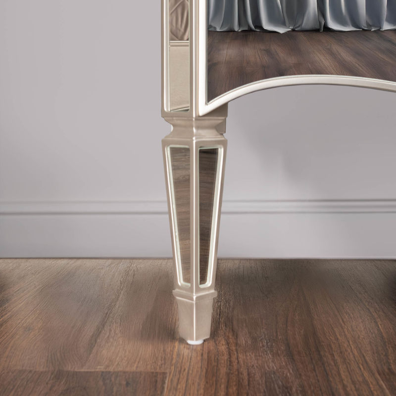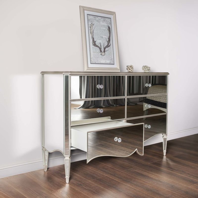 Столешница покрыта лаком, цвет - серебряное напыление. Боковые поверхности, фасады и ножки декорированы зеркалами. На ножках металлические колпачки. 6 выдвижных ящика с направляющими скрытого типа. Направляющие с доводчиками для плавного закрывания.