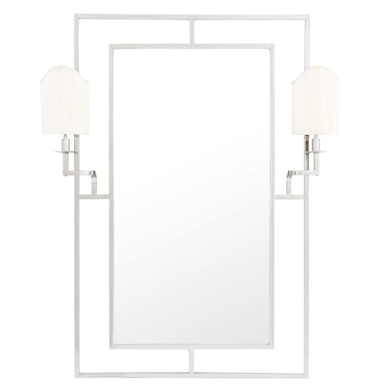 Прямоугольное зеркало в раме из стали и железа. Оснащено двумя бра с абажурами.