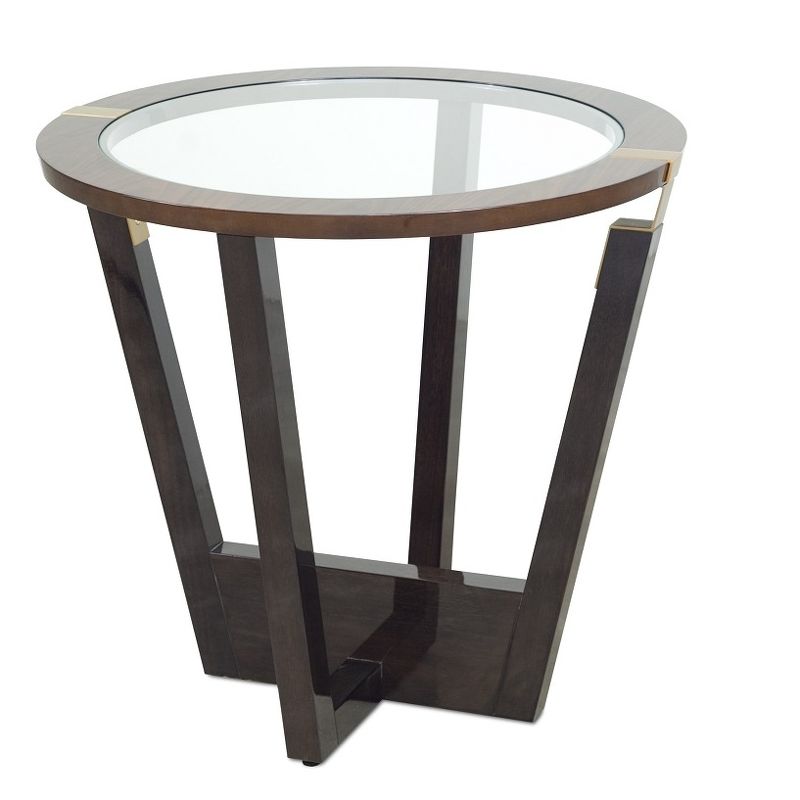 Приставной столик, отделка 709 глянцевый миндальный орех, 725 глянцевый шпон темного ореха, M02 латунь, стекло
