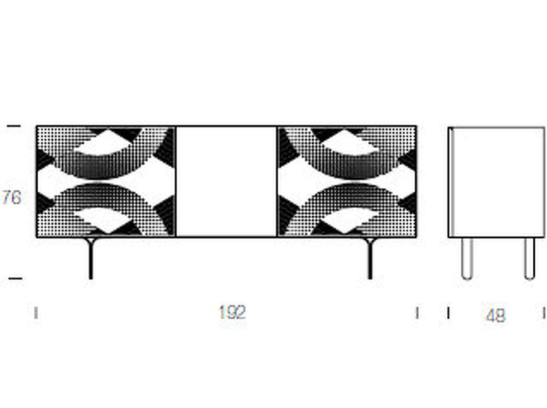 Буфет на прямых металлических ножках выполнен в стиле модерн. Оснащен двумя дверцами с декоративным орнаментом на фасадах и ящиком. Внутри стеклянные полки.