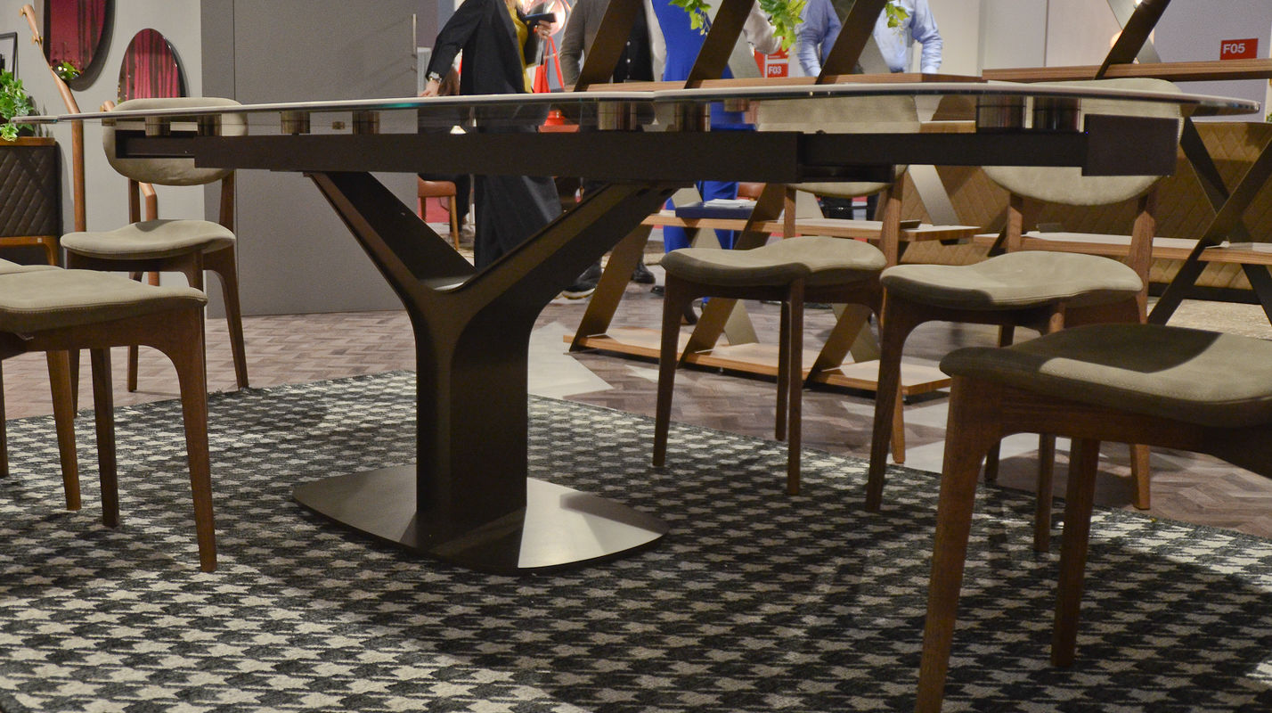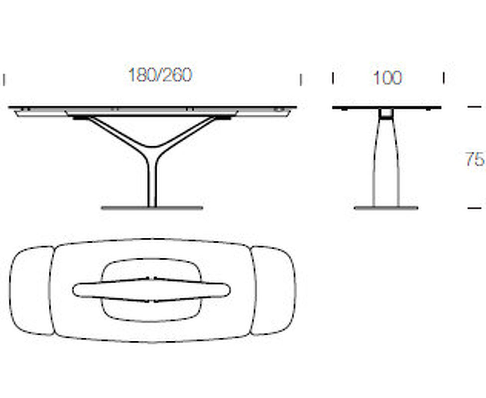 Прямоугольный обеденный стол на фигурной стальной ножке выполнен в стиле модерн. Дополнен керамической столешницей со скругленными углами и двумя расширениями. Длина в сложенном виде 180 см, в разложенном - 260 см.