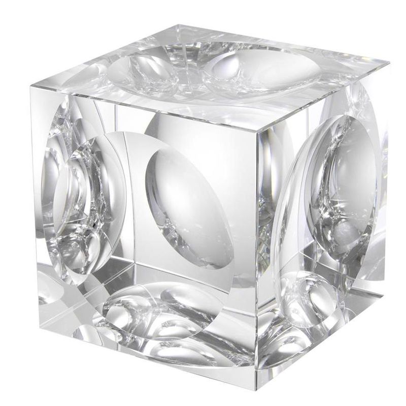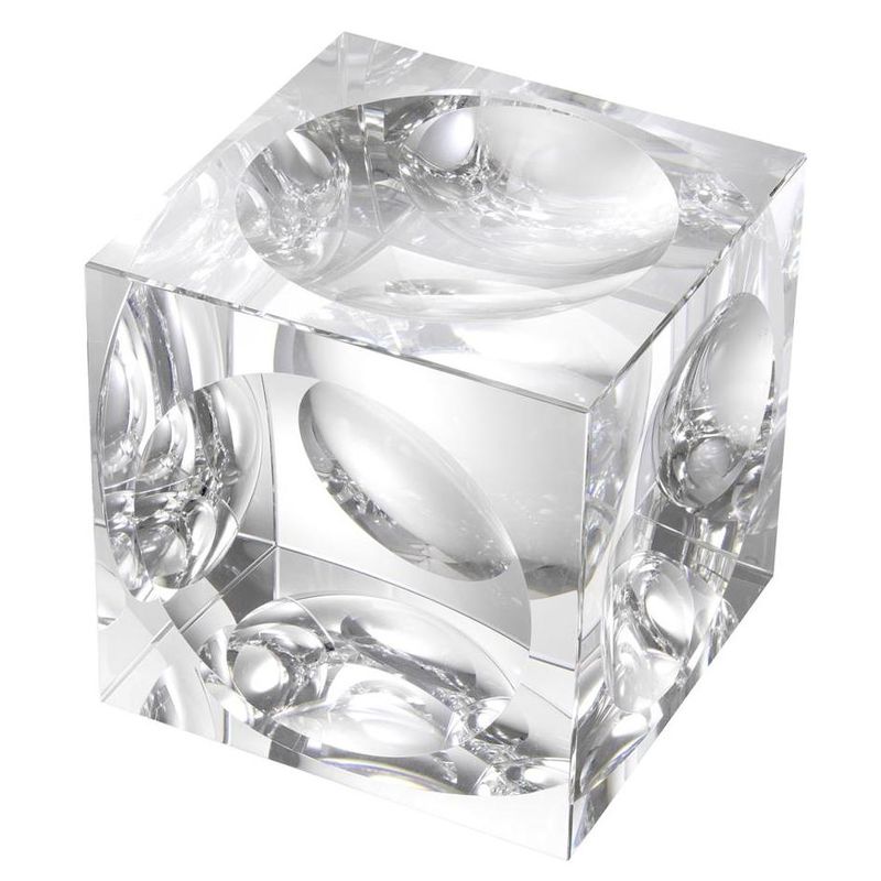 Декоративный элемент в виде куба выполнен из прозрачного стекла. Грани декорированы вогнутыми дисками.